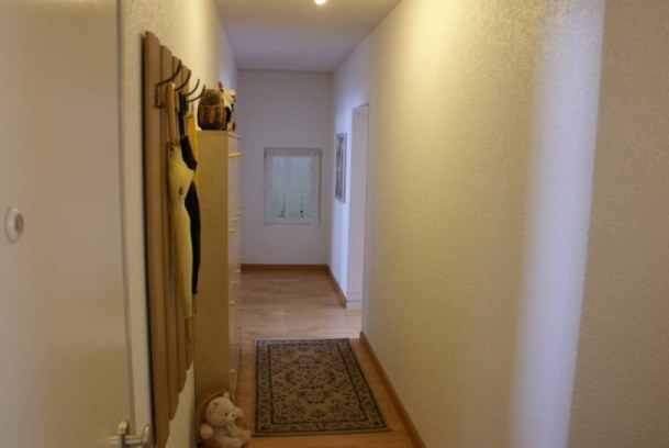 Flur mit Blick Richtung Wohnzimmer Fenster war ürsprünglich für die Bedienung technischer Geräte eines Aquariums Rechts ist Küchentür zu sehen |