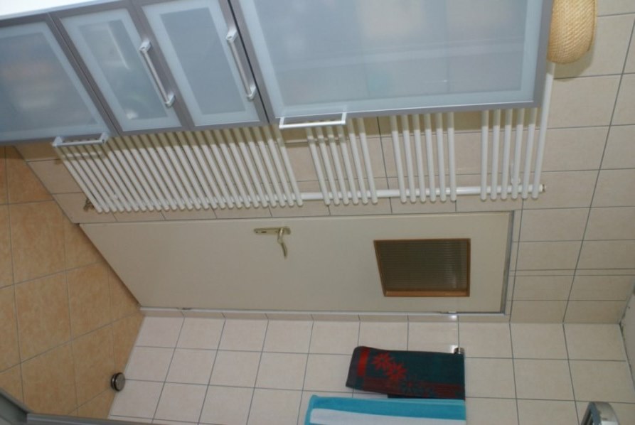 Handtuchheizkörper (oben in der Ecke ist noch vom Fließen kleben der Mörtel zu sehen, ist inzwischen gemalert) |