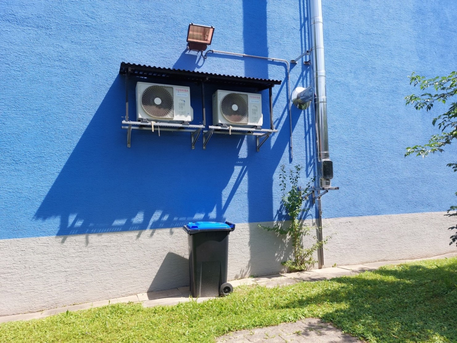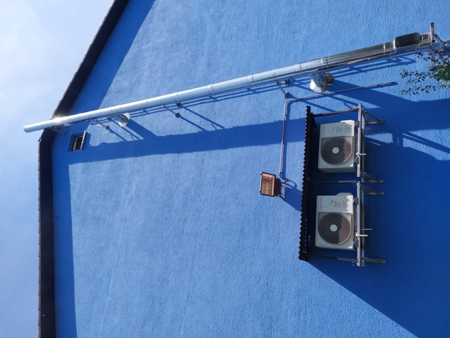 Edelstahlkamin für Wohnzimmerofen sowie die Aussengeräte der Klimageräte/Wärmepumpe von Küche, Esszimmer und Wohnzimmer |